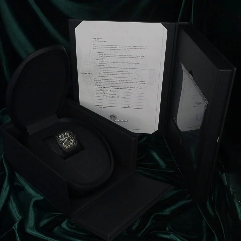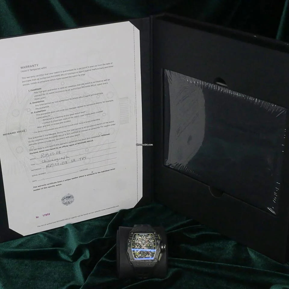 Presents itself in mint condition with little to no signs of wear. Featuring a dial that captivates with its open-worked construction, where every gear, bridge, and chronograph register is part of the display. The bezel, crafted in Carbon TPT, offers a distinctive wave-like texture under the light, while the sapphire caseback showcases the movement in full detail. Completing the look, the strap in textured black rubber keeps the oversized tonneau case balanced and comfortable, ready for extended wear. Functions include hours, minutes, seconds, date, month, and chronograph. The minute hand and date wheel can be adjusted using the crown on the right side of the watch. The upper pusher starts and stops the chronograph, while the lower pusher resets it and engages the flyback function for instant re-timing. Luminous hands and hour markers glow brightly against the skeletonized dial, keeping the complex display legible even in low light. Comes as a full set, double boxed, including the watch pillow, warranty documentation, and user manual. By showcasing its movement through a skeletonized dial and pairing it with a lightweight carbon-titanium tonneau case, the RM 11-03 embodies the brand’s vision of turning engineering into art. More than a timepiece, it represents the fusion of motorsport innovation and collector status – qualities that continue to draw attention on and off the track. |